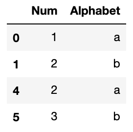 예시데이터에서 ['Num', 'Alphabet']을 쌍으로 취급하여 중복을 제거하였기에 각 열에는 여전히 중복되는 데이터가 남아있다.